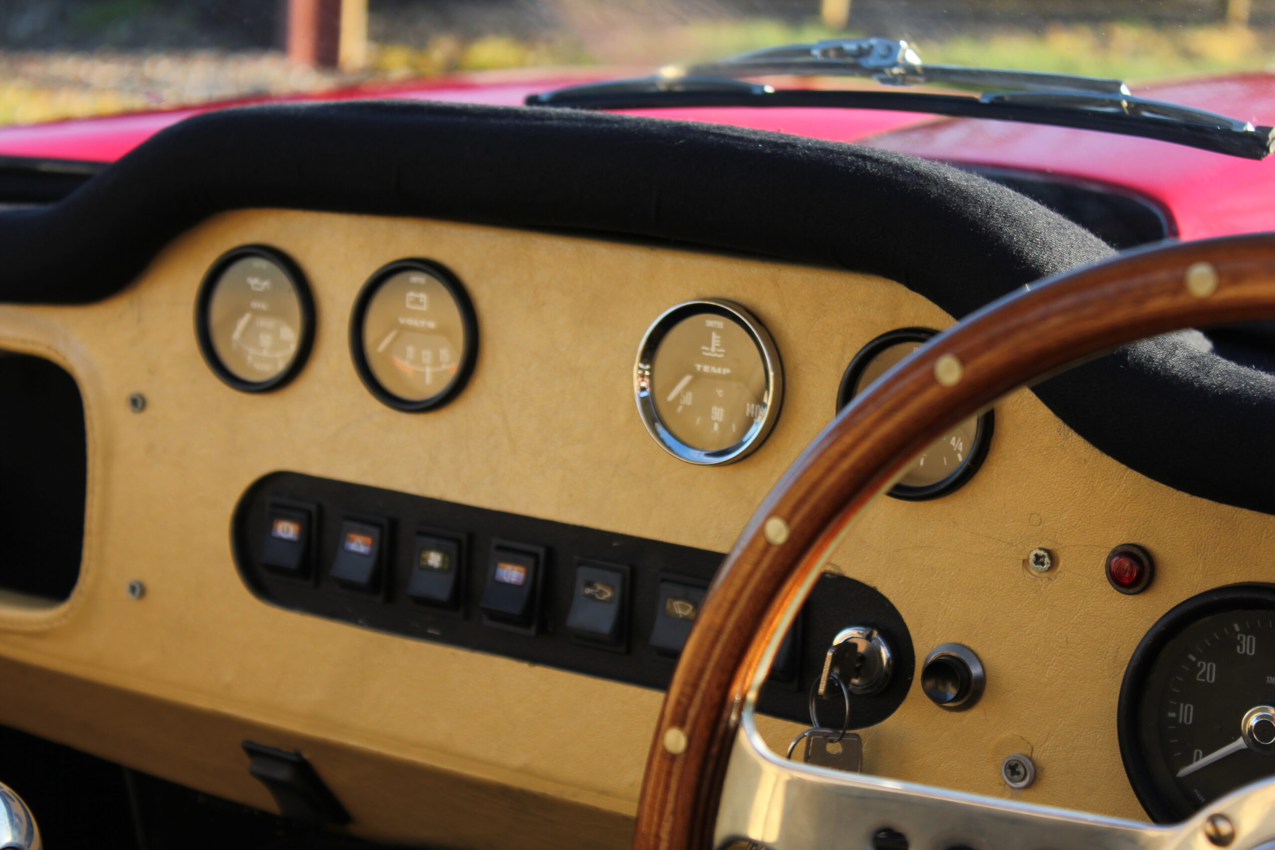 This Marcos GT was supplied as a kit in 1981 and later completed by Marcos Heritage, being assembled and first registered in 2004. With only 1,772 miles recorded and two owners from new, it remains a very low-use example of the later continuation GT models. Finished in red with a tan interior, it presents the familiar long bonnet, compact cabin, and distinctive flowing bodywork that have become synonymous with the marque. The interior retains a traditional layout with analogue instrumentation and a wood-rimmed steering wheel, offering a simple and period-appropriate driving environment.